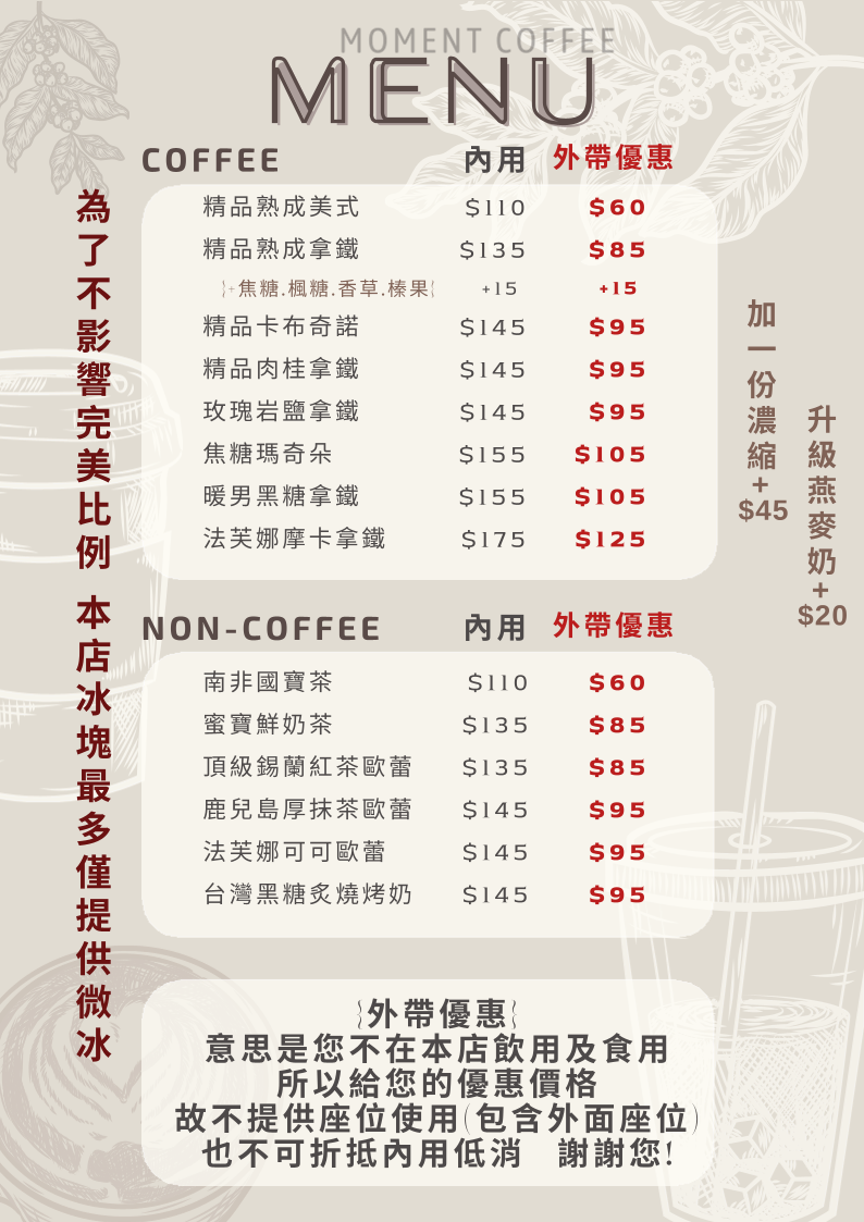 墨門珈琲 Moment Coffee (內用時間到18:30) Menu